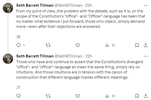 You can spend much of your life reading the evidence Tillman has assembled in support of this framework. Since the 2021 insurrection at the Capitol, Tillman has gone supercharged. He (with co-author Blackman) is now on Part IV of a planned ten-part series on Offices and Officers of the Constitution that makes me tired just looking at it. (That is a compliment.)