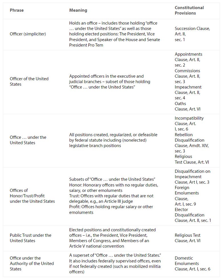 Tillman, leveraging his legal contacts throughout the British Commonwealth, has developed a framework to fit the Constitution’s language together with itself and with the English legal tradition. Even William Baude, who sharply criticized Tillman’s theory with respect to Section Three in the Baude-Paulsen paper on insurrection, has effusively praised Tillman’s scholarship and framework for understanding the term “officer,” though without actually endorsing it. It is from Baude (and Margo Uhrman) that I borrow this chart describing Tillman’s framework:
