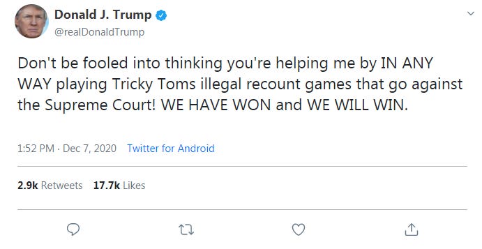 Again, most news junkies were paying attention to the daily Trumpian dramas, not the quixotic details of a barely-contested electoral count. Do you remember Jill Stein's three-state recount of the 2016 election? Exactly. Few noticed and fewer cared.