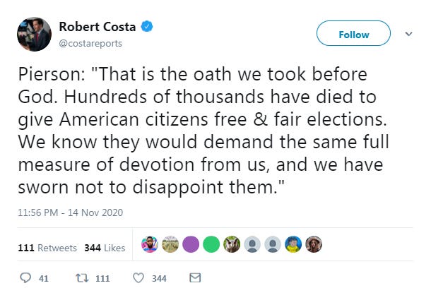 If you yourself have finished this narrative and think that there is, in fact, a single, clear, legitimate President of the United States (and, by extension, a clear usurper), if you think this without even actually reading the Pierson-Ratcliffe report or the Supreme Court opinions in Biden v. Pennsylvania, then you may well be an illustration of the problem—a soldier-in-waiting for one side or the other. Someone who maybe, deep down, just a little, wants this to happen, so you can finally rid the nation of the Bad Guys forever.
