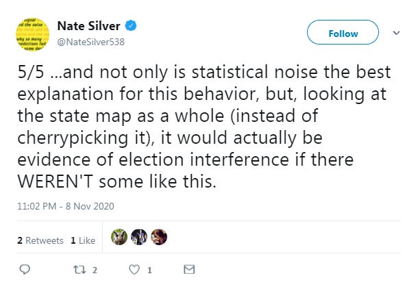 On November 9th, 2020, Silver followed-up with a thorough, slightly personal rebuttal of Wang's findings on FiveThirtyEight. One of Silver's key points: none of the affected districts used paperless electronic voting, so, even if there was error or fraud, it would be caught during the automatic recount.