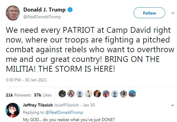 The Battle of Camp David swiftly escalated, as both presidents called upon every military or police resource they could command, cajole, or trick into supporting them—even though command-and-control on the ground was swiftly crumbling. Biden had a time advantage with the Maryland National Guard on its way and the home field advantage, but Trump got on Twitter and literally called out the militia: