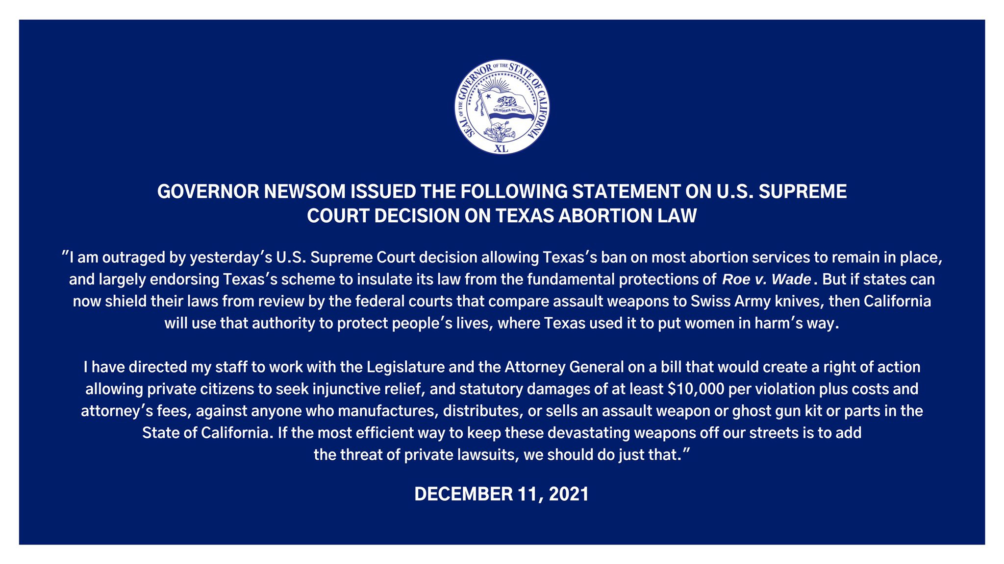 Late yesterday, Gov. Gavin Newsom of California was the first governor of another state to take advantage of the Texas roadmap. He proposed a new state law that would ban the sale of so-called assault weapons and “ghost guns” (guns assembled at home, from parts purchased online, thus with no serial registration number/background check), and he used the same basic framework as Texas: instead of having the state government enforce this law, he’s proposing to have the law enforced by private citizens in lawsuits where the deck is stacked against the defendants, making it very costly for gun-makers to litigate.