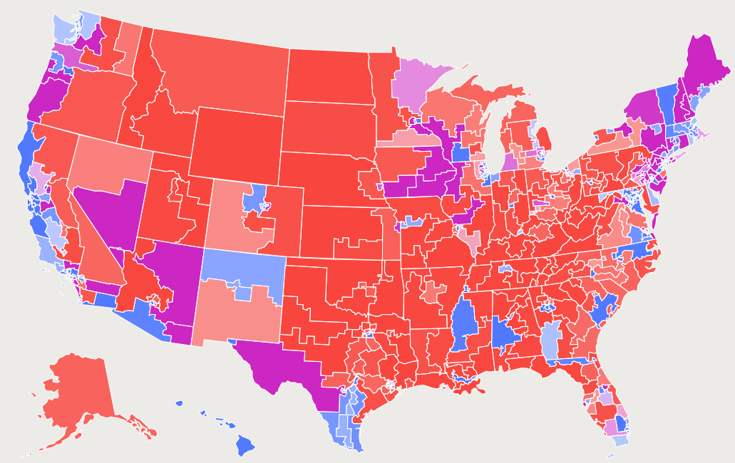 The national political effects of this would be delightfully neutral, too. In 2018, FiveThirtyEight published The Atlas of Redistricting, which showed what the map would look like if this technique were rolled out nationally. First, for comparison, here’s the actual map that existed in 2018: