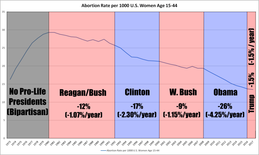 For all their faults, Republican presidents, senators, and state legislators have saved countless thousands by their vigilant opposition to abortion... and many of their greatest gains have come while a Democrat in the White House was still working to undo a predecessor's protections for the unborn. Lots of these reductions could not have come about if Democrats had held the White House for longer -- and Democratic proposals like abolishing state-level restrictions and repealing the Hyde Amendment would certainly increase the abortion rate, as even Guttmacher recognizes. By contrast, Republicans would almost certainly have achieved deeper reductions in the abortion rate if they had held office longer, with a freer hand to appoint more judges and pass more laws without anti-unborn Democrat opposition.