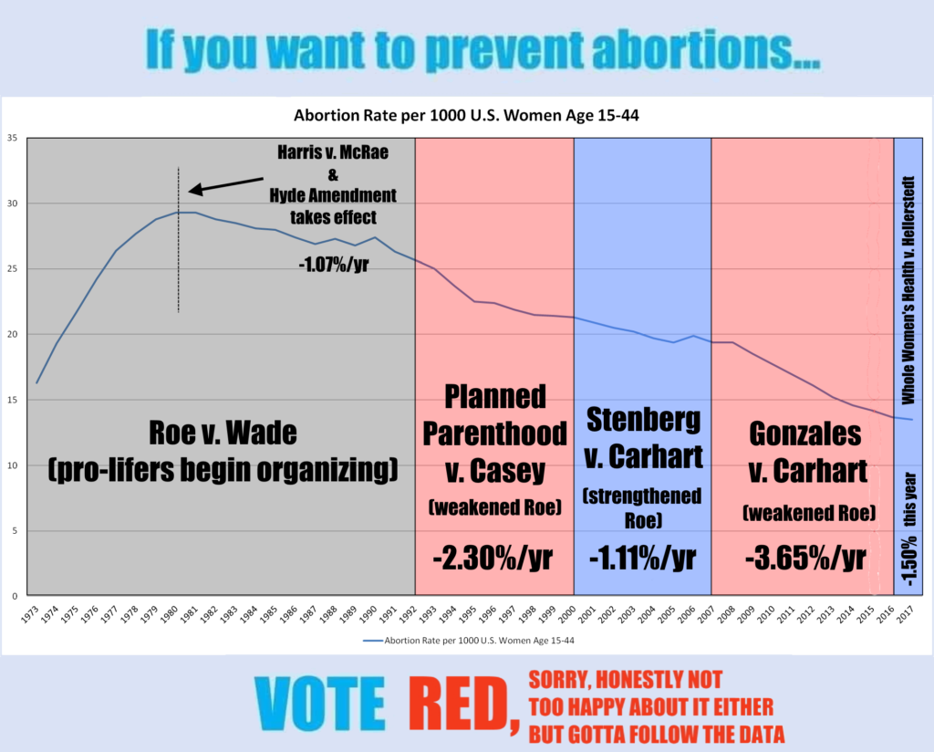 There's almost certainly some truth in this revised chart. (There is very little, if any, in the original.) We have good, solid demonstrations going back thirty years that incremental pro-life legislation passed at the state level reduces abortions, and we can clearly associate favorable court rulings with new waves of pro-life legislation. We know that restriction and abolition work: there is probably no faster way to reduce the abortion rate than outlawing abortion. (See above; also here and here, among others.) It should be surprising to absolutely no one that waves of anti-abortion legislation following favorable court rulings were soon followed by faster declines in the abortion rate. And those favorable court rulings--even the weak ones--are all owed to judges appointed by Republican presidents.
