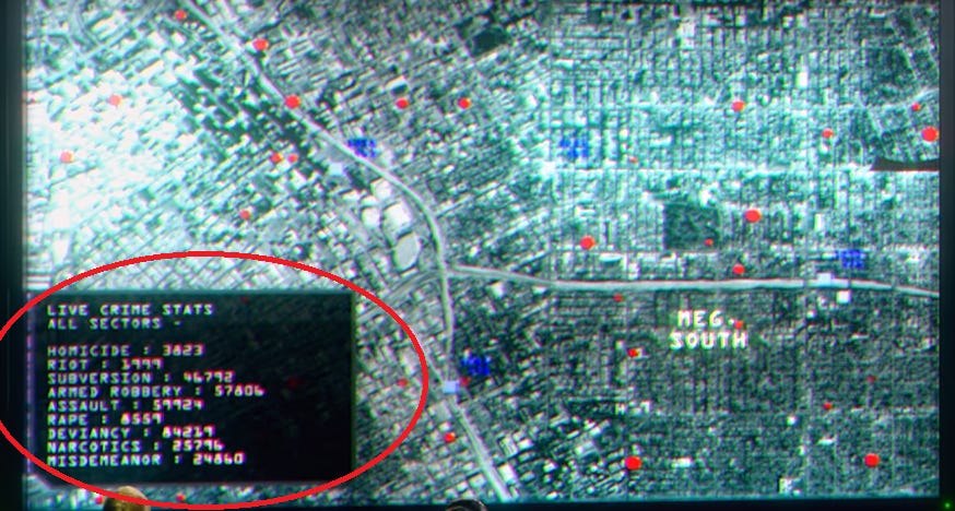 Dredd’s law, by contrast, is animated by other concerns. The Hall of Justice is principally concerned with homicide, riot, armed robbery, assault, rape, “deviancy,” and drugs:9