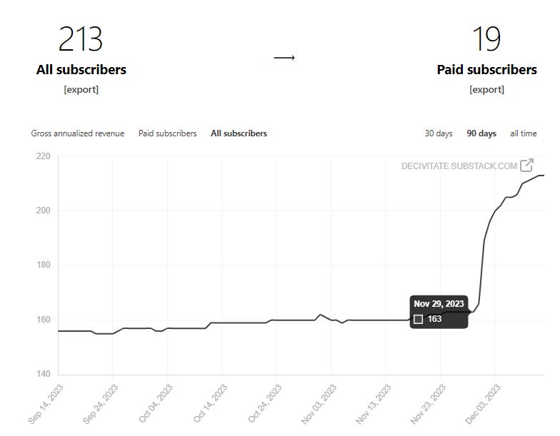 However, I owe the freelisters something, too. Somehow, I ended up included in Scott Alexander’s November Links Roundup.2 The ACX Effect was… well, see for yourself: