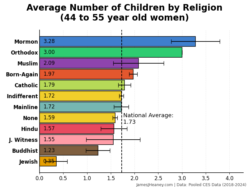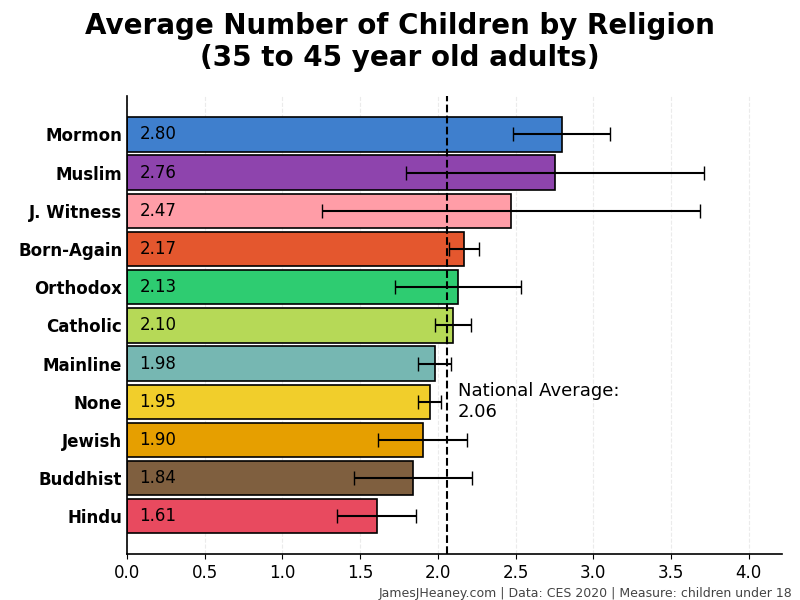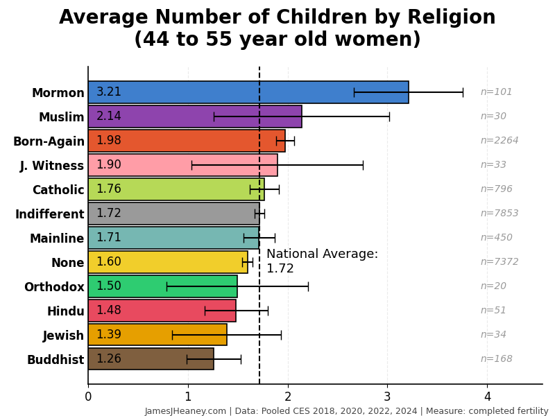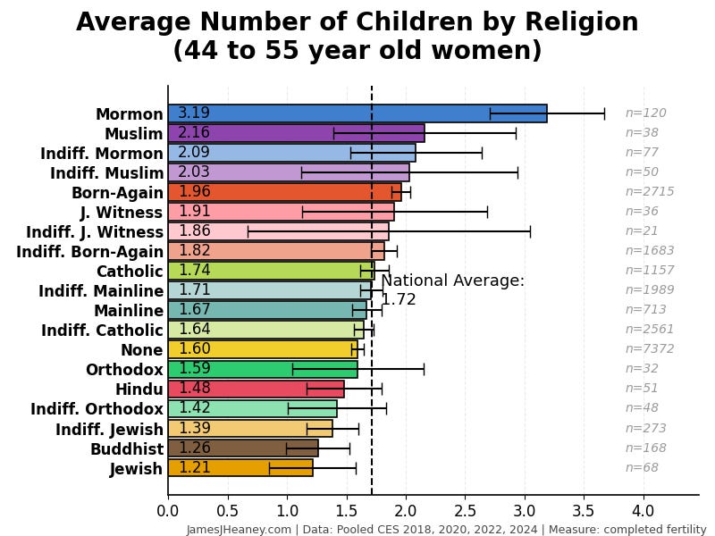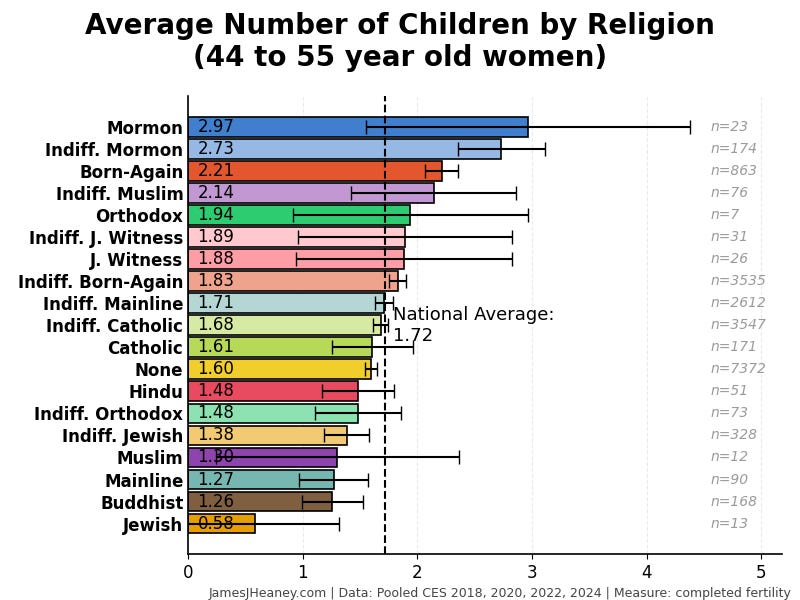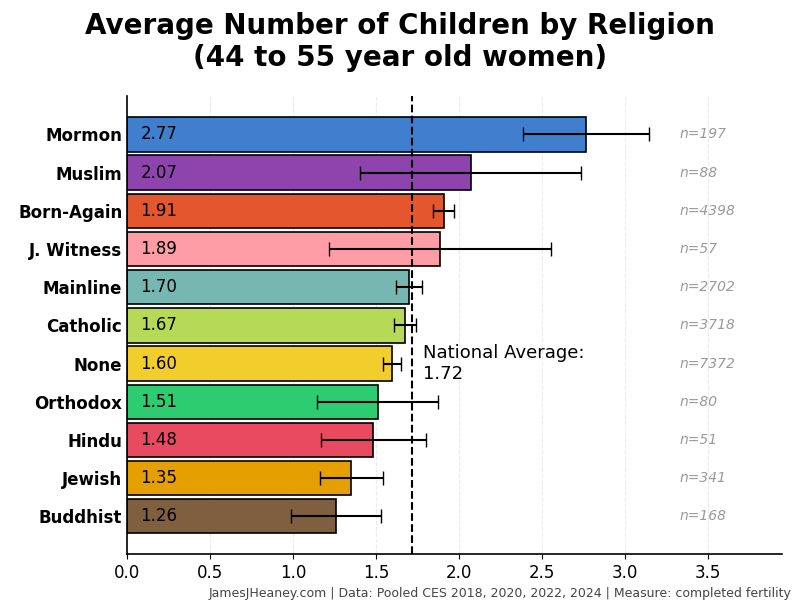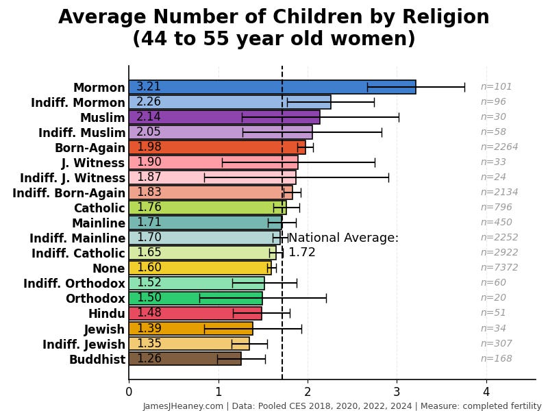 Every two years, the Cooperative Election Survey asks 60,000 Americans a bunch of questions. Over the past four surveys (~240,000 validated Americans), here is how many babies women had in each of several major religions:1