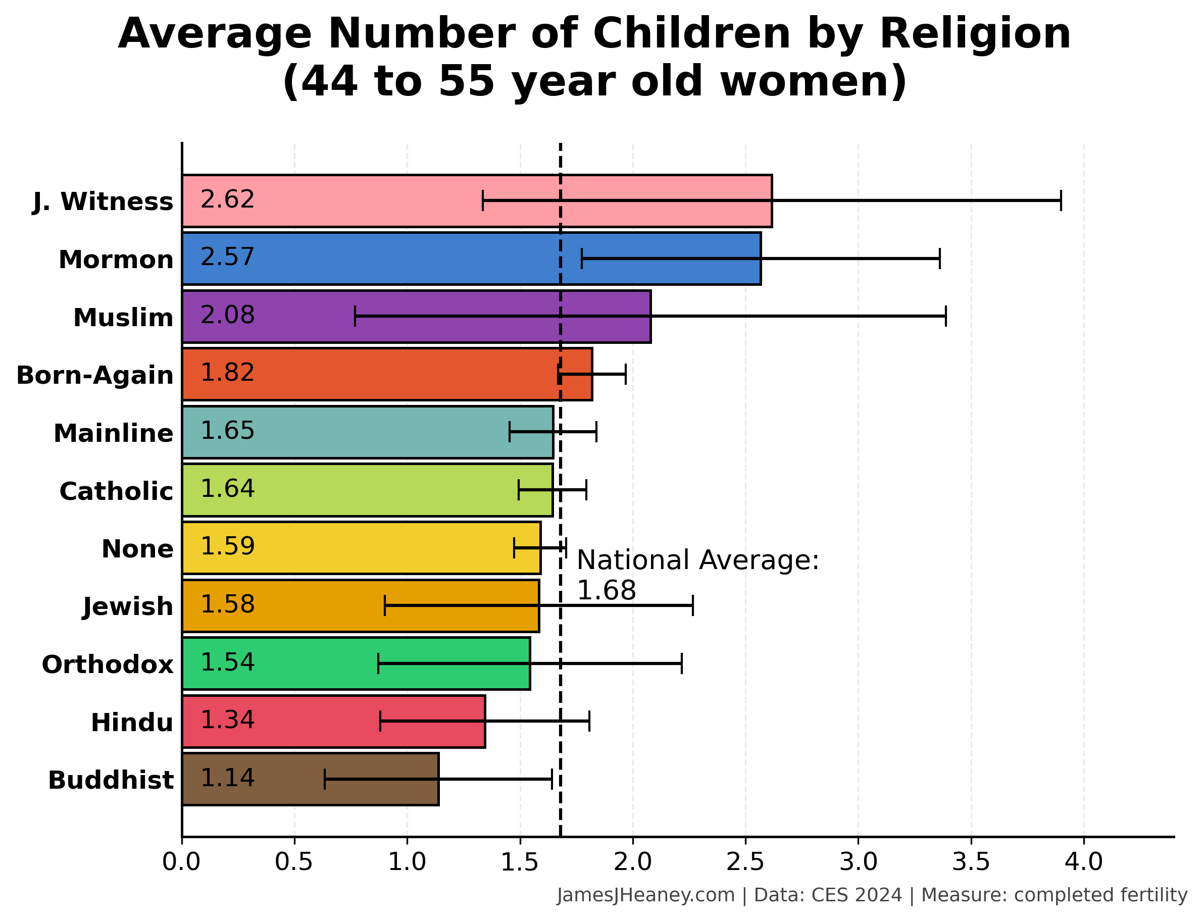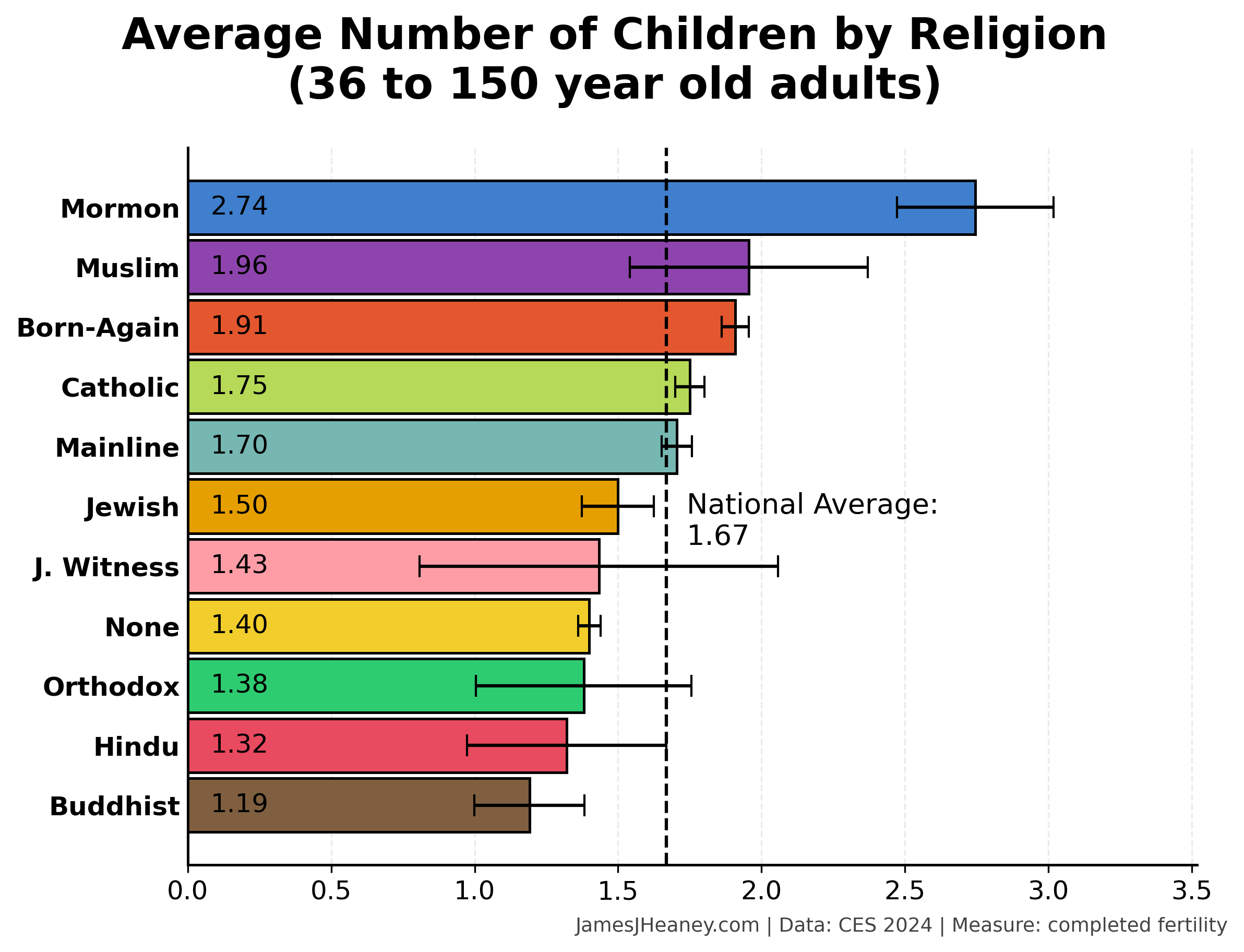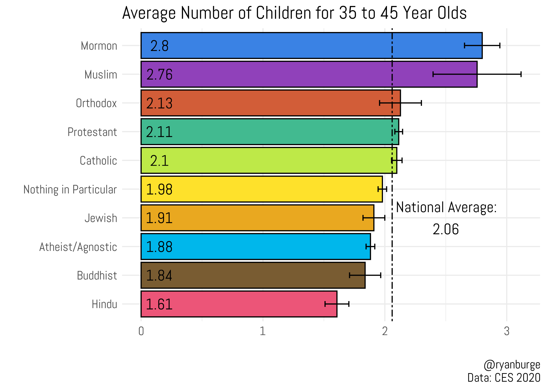 Every two years, the Cooperative Election Survey asks 60,000 Americans a bunch of questions. Over the past four surveys (~240,000 validated Americans), here is how many babies women had in each of several major religions:1