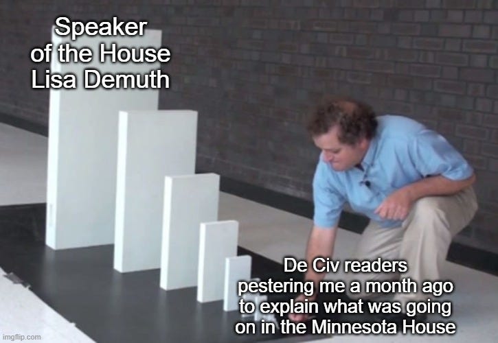 Instead, you got me looking deeply into the standoff, we all learned some things, Minnesota now has its first Black female Speaker of the House, and there’s good reason to believe that there’s at least some connection between those three facts.