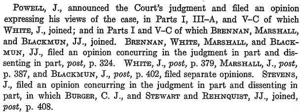 For example, in the case above (The Regents v. Bakke), four justices thought the Regents should win, and four justices thought Mr. Bakke should win. The ninth justice, Justice Powell, thought the Regents should win one part, but that Mr. Bakke should win another part. That made five votes for the Regents to win the first part, and five votes for Mr. Bakke to win the second part, which settled the outcome. Justice Powell also rejected the reasoning of both blocs of justices, and came up with his own idiosyncratic argument that supported elements of both camps. In this case, Justice Powell was the only justice who supported the compromise reasoning, but, since he supported the majority outcomes on the narrowest grounds, his opinion was the only one that counted as precedent.