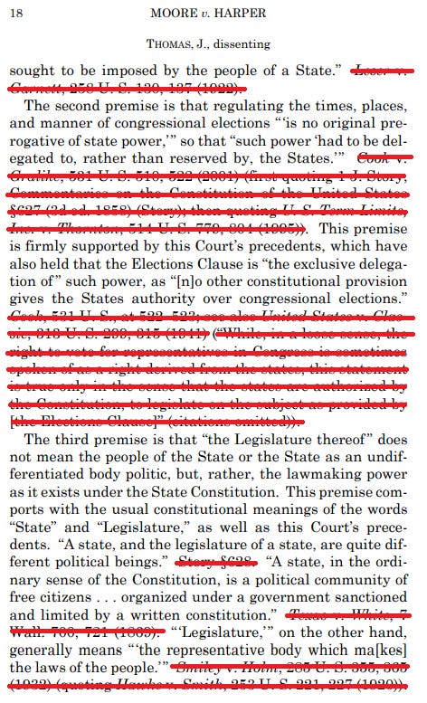 Alas, in Moore v. Harper, Thomas did convince me. I read his dissent shortly before I started typing this article, and now I think a narrow version of the Independent State Legislature doctrine is correct.7 My snap judgment of the case was wrong… I think.