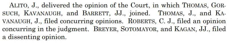 Justice Alito, supported by 5 justices, wrote a majority opinion. Because both the outcome and the reasoning were supported by a majority of the judges in the case, Alito’s opinion became a binding precedent that all lower courts must follow.