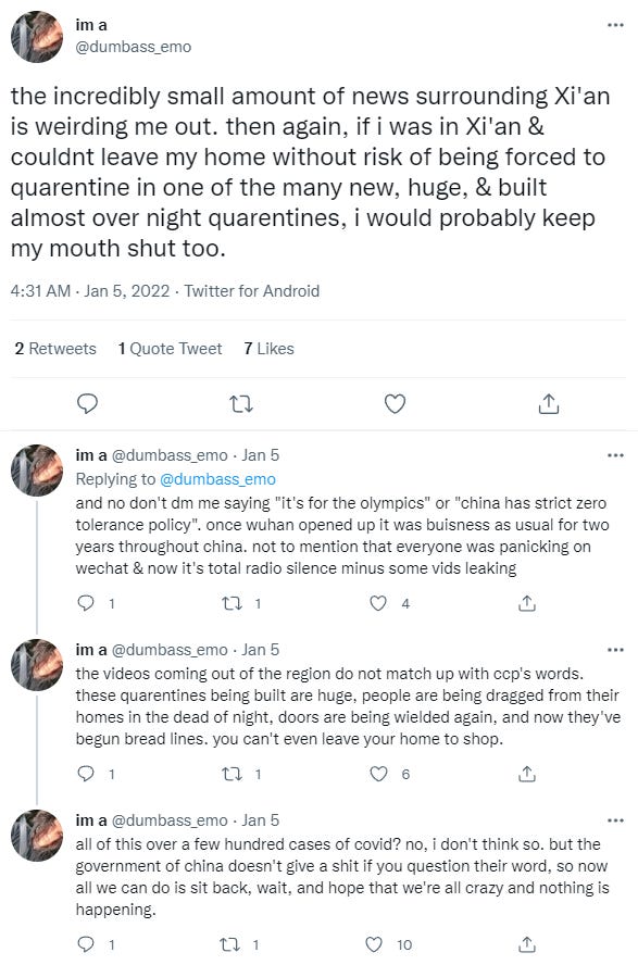 So this post is me erring on the side of sharing my thoughts early instead of sitting on them until I’m certain. It’s the first week of January again. I’ve been loosely following Xi’an since Christmas, when the Chinese city of 13 million entered hard lockdown.