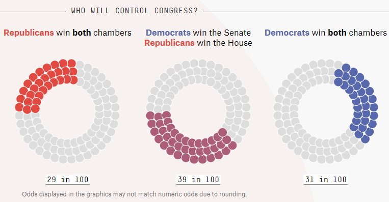 Nevertheless, if either Scenario 2 or Scenario 3 came to pass, it would come as a huge shock to a lot of people, and media would represent it as historic. (Well… if the Democrats win. If the Republicans win, media will represent it as a historic catastrophe for America, replaying the 2016 greatest hits.) Why is that? The “Republicans and Democrats split Congress” outcome is technically the most likely outcome, yes… but that “most likely” still only happens about one-third of the time! We have about a two-thirds chance of waking up the day after Election Day to full control of Congress by one party or the other!