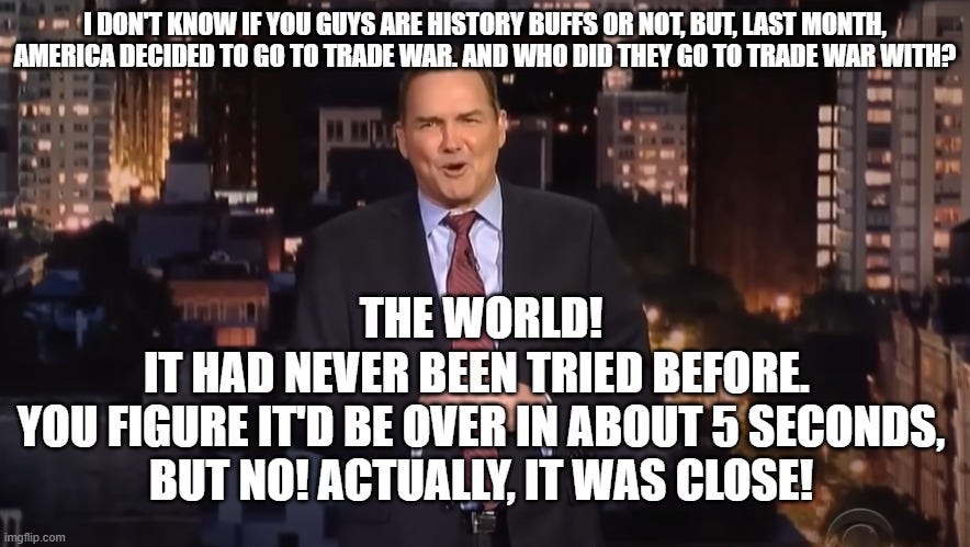 Oh, wait, sorry, I’m getting something on my earpiece… Oh, okay. Apparently, we are now in a trade war with… the world?!