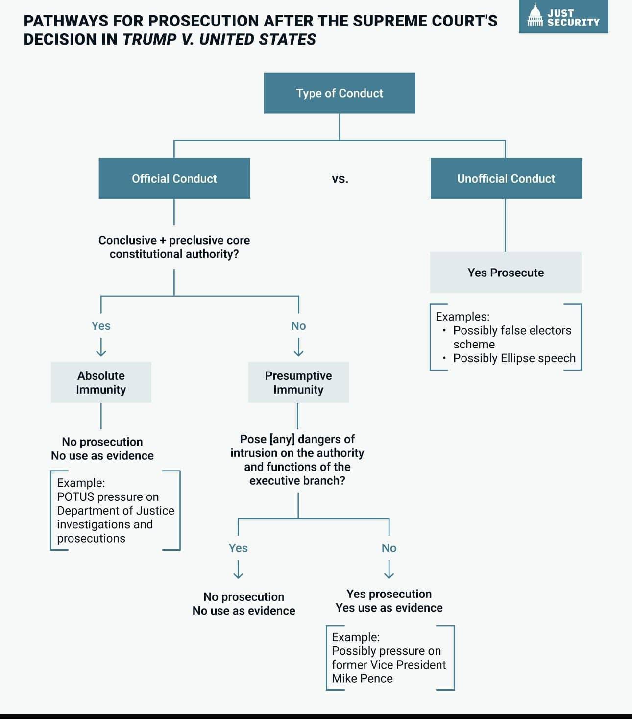 ![May be a graphic of map, blueprint and text that says 'PATHWAYS FOR PROSECUTION AFTER DECISION IN TRUMP V. UNITED STATES SUPREME COURT'S JUST TRII SECURITY Type of Conduct Official Conduct vs. Unofficial Conduct Conclusive preclusive core constitutional authority? Yes Yes Prosecute No Absolute Immunity Examples: false electors Presumptive Immunity Possibly Ellipse speech No prosecution No use evidence Pose [any] dangers of intrusion the authority and functions the executive branch? Example: POTUS pressure on Department Justice investigations and prosecutions Yes No No prosecution No use as evidence Yes prosecution Yes use as evidence Example: pressure on President Mike Pence' May be a graphic of map, blueprint and text that says 'PATHWAYS FOR PROSECUTION AFTER DECISION IN TRUMP V. UNITED STATES SUPREME COURT'S JUST TRII SECURITY Type of Conduct Official Conduct vs. Unofficial Conduct Conclusive preclusive core constitutional authority? Yes Yes Prosecute No Absolute Immunity Examples: false electors Presumptive Immunity Possibly Ellipse speech No prosecution No use evidence Pose [any] dangers of intrusion the authority and functions the executive branch? Example: POTUS pressure on Department Justice investigations and prosecutions Yes No No prosecution No use as evidence Yes prosecution Yes use as evidence Example: pressure on President Mike Pence'](https://substackcdn.com/image/fetch/$s_!XWcO!,w_1456,c_limit,f_auto,q_auto:good,fl_progressive:steep/https%3A%2F%2Fsubstack-post-media.s3.amazonaws.com%2Fpublic%2Fimages%2F5d30f05d-d1ba-496d-908e-3feac443394e_1290x1467.jpeg)
