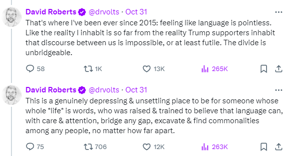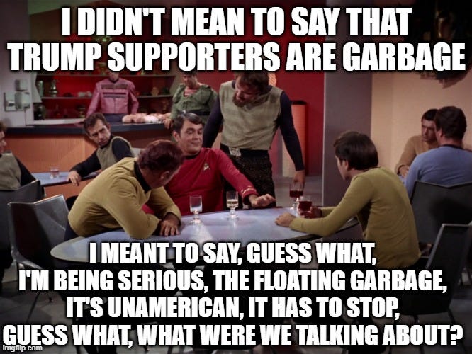 I have to admit that my own loathing of Trump is not exclusively rational. I viscerally dislike him. At least some of that is surely because he is not part of my social class, has no interest in joining my social class, and loves nothing more than flinging the norms of my social class in my face. (He also committed adultery with a porn star and paid her hush money, which is just objective morality.) He represented a breach in the Westeros Wall that many gentry-Americans are still processing: