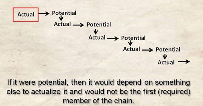 We are forced, then, to face the other possible explanation for a changer. As I said, logically, there are only two possibilities: if a changer didn’t become actual because of some other changer making it actual… then it must be the case that the changer never became actual, because it was always actual. There is still no third option. Aristotle realized that every single change we see in the world today can only be explained by something that has always been actual. When we see any change, either it is directly caused by something that has always been actual, or it is caused by some other changer. If it was caused by some other changer, then that changer must either be caused by something that has always been actual, too, and so on until—inevitably, inescapably—we arrive at some changer that has always been actual, an Unchanged Changer. Aristotle proved that at least one Unchanged Changer must have always been actual, as a bedrock logical certainty.