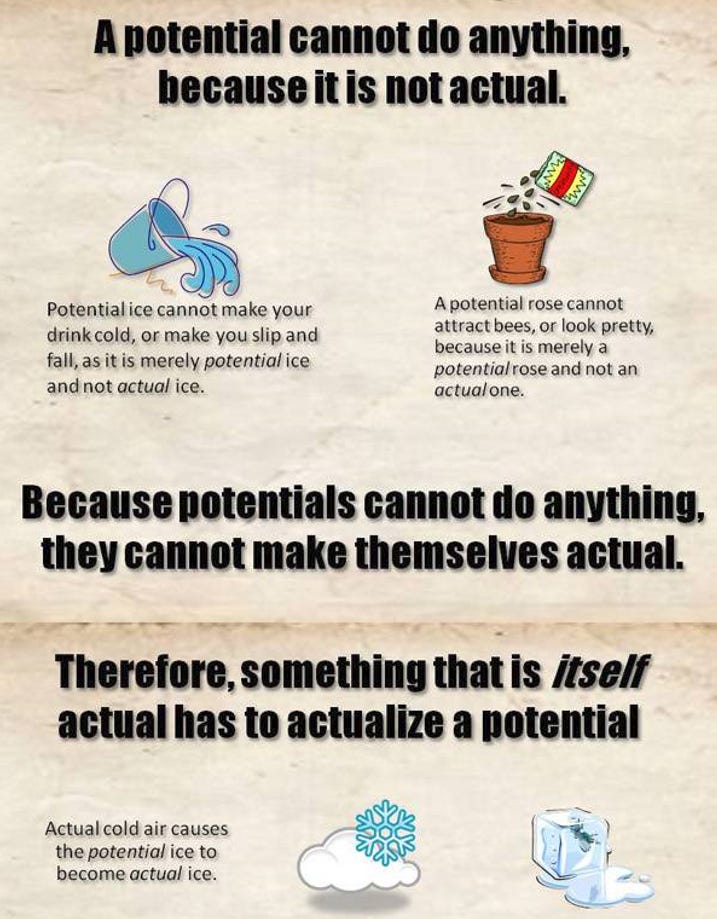 True enough. We pay the big bucks for Catholic school so that you are exposed to these ideas early and often. Mrs. Quillan did a great job covering this in sixth-grade theology.4 However, that was the sixth-grade version. When you learned this argument, it ended here, with “…and the Unchanged Changer is God.” You simply have to take shortcuts when teaching sixth-graders philosophy. However, you’re older now, and I’m preparing you for the rest of your life, so we can’t take that shortcut today.