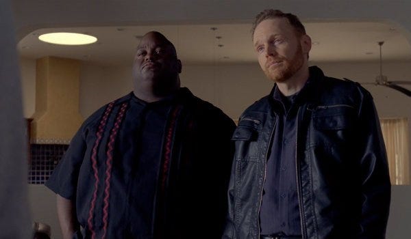 The friendly guy explains that his companion is another local resident who feels very strongly about the importance of supporting local charity. The burly guy growls that he’ll hang you from a tree if you don’t pay up right now. The friendly guy says, “Hey, I don’t know the big guy, but he has a point, doesn’t he?”